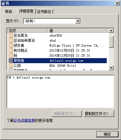 如下图所示为DV超快SSL证书, 主题中只显示网站的域名(CN字段),不显示申请单位的名称。颁发者为:CA 沃通免费SSL证书,证书主题中只显示网站的域名(CN字段),不显示单位名称“O”字段。WoSign所有证书都支持采用最安全的SHA1或SHA256 RSA签名算法和2048位公钥长度。